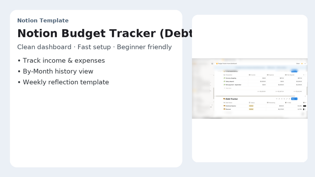 A clean, beginner-friendly Notion system to track income & expenses, pay down debt, and grow savings—without spreadsheets or overwhelm. See your monthly net at a glance, update everything in minutes, and stay consistent with a lightweight weekly reflection.