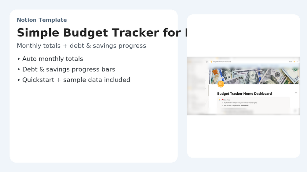 A clean, beginner-friendly Notion system to track income & expenses, pay down debt, and grow savings—without spreadsheets or overwhelm. See your monthly net at a glance, update everything in minutes, and stay consistent with a lightweight weekly reflection.