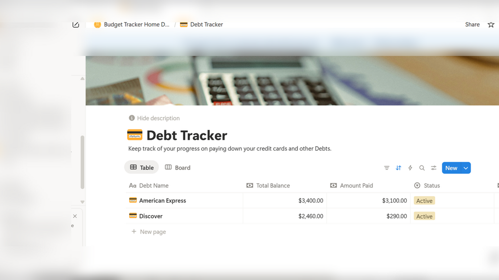 - Debt Tracker — Remaining, % Paid, visual progress bar